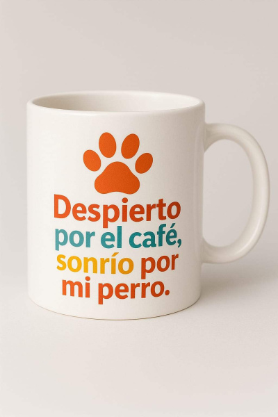 Taza para cafe ,con la frase , despierto por el cafe , sonrio por mi perro